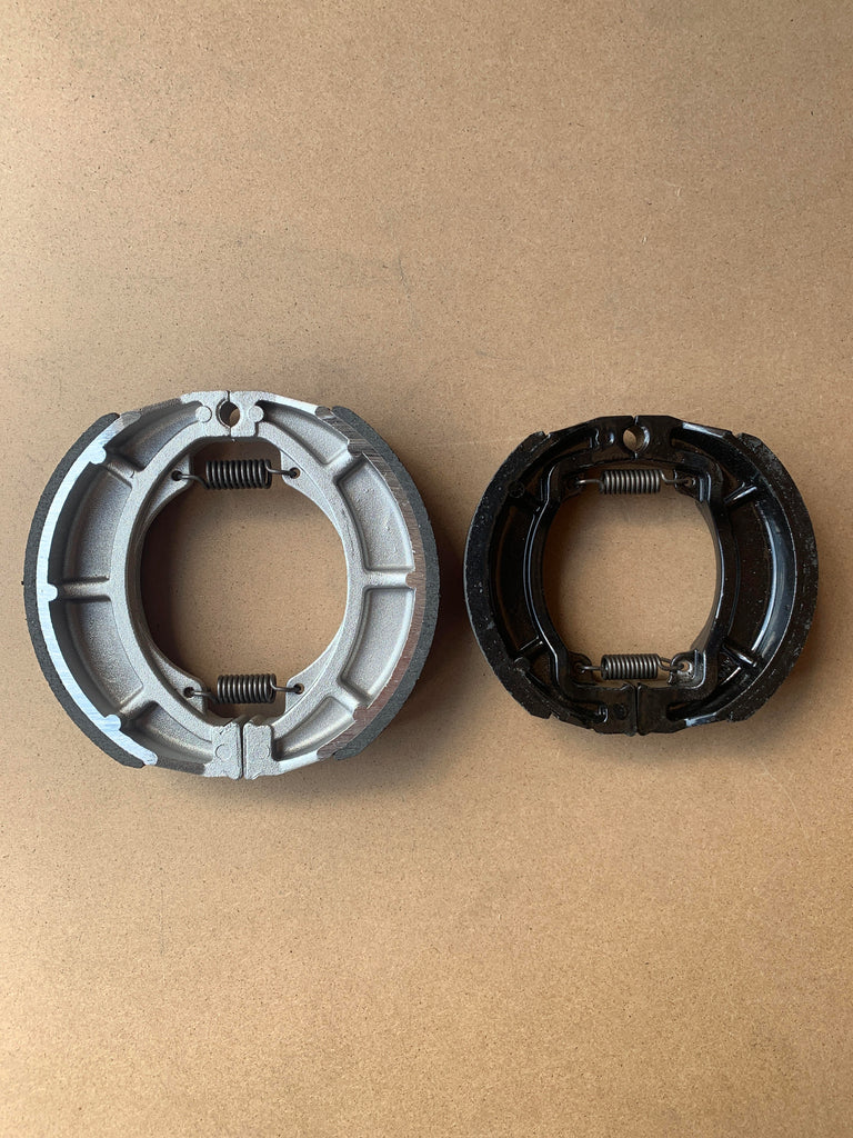 This set of brake drum shoes have been manufactured to replace the original front and rear set of brake drum shoes on a Kawasaki KH100 for the years and models shown above.