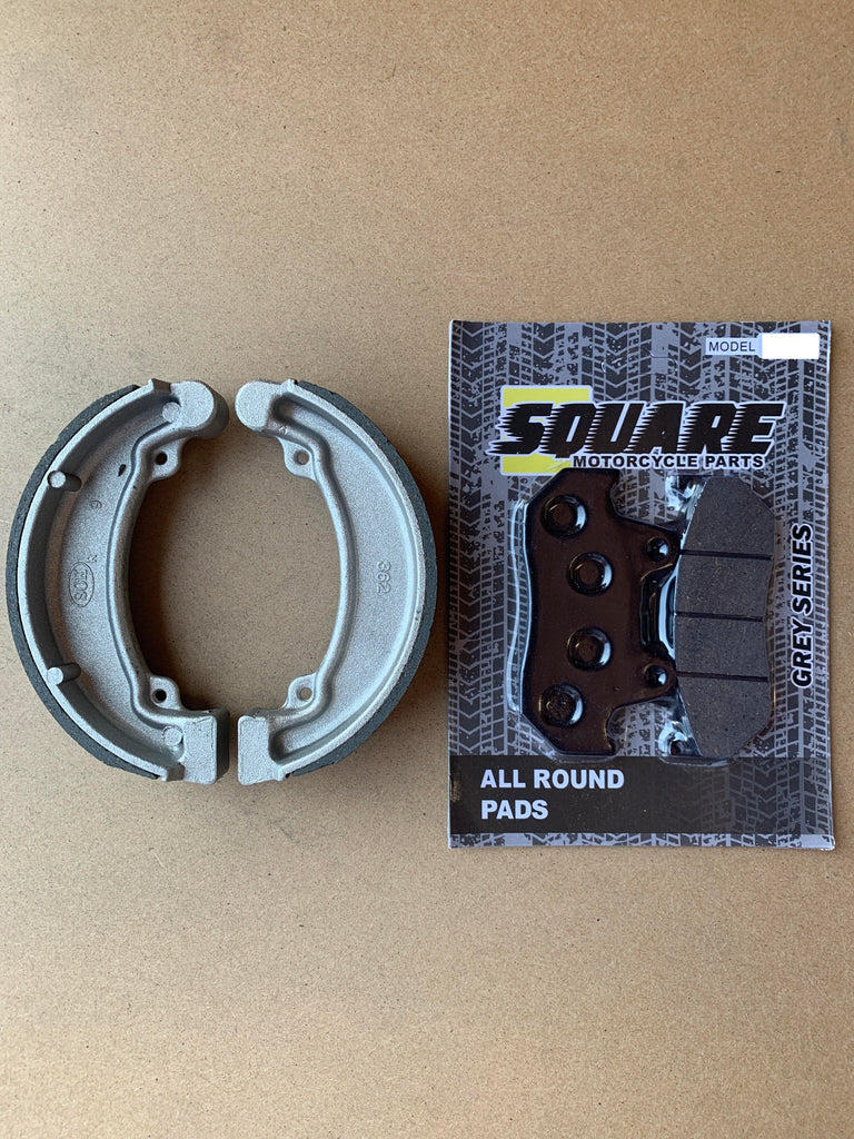 This set of front brake pads and rear brake drum shoes have been manufactured to replace the original brake sets on a Honda CB125 for the years and models shown above.