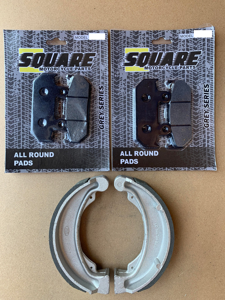 This set of front brake pads and rear brake drum shoes have been manufactured to replace the original brake sets on a Honda CBR250 for the years and models shown above.