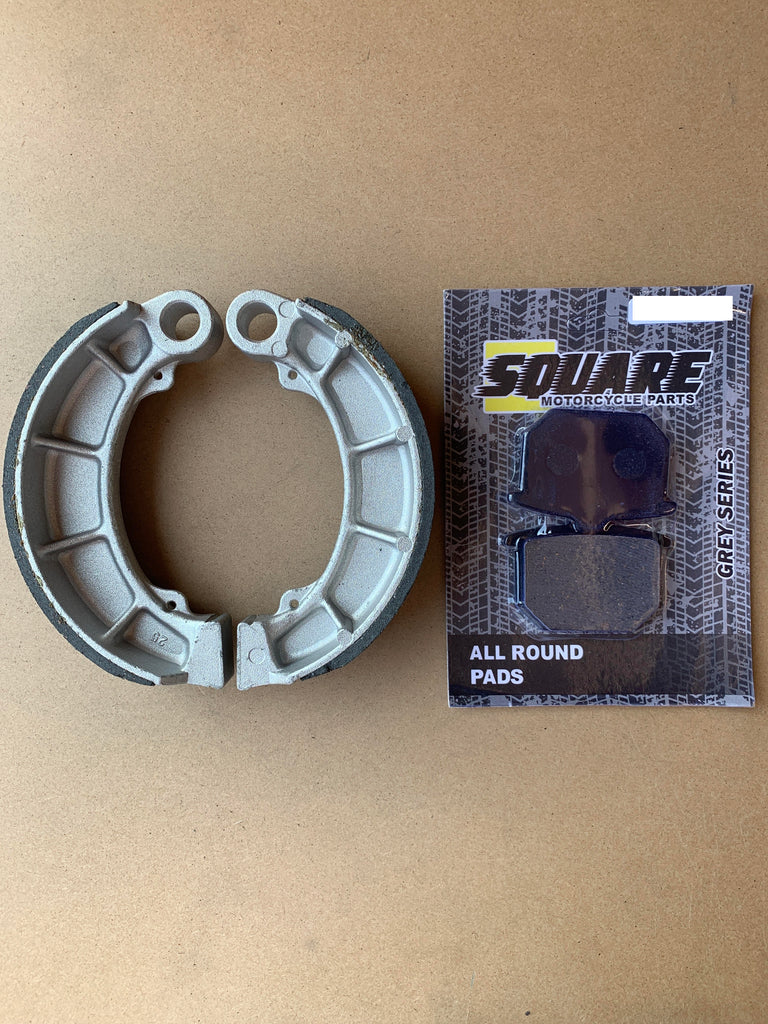 This set of front brake pads and rear brake drum shoes have been manufactured to replace the original brake sets on a Honda CX500 for the years and models shown above.