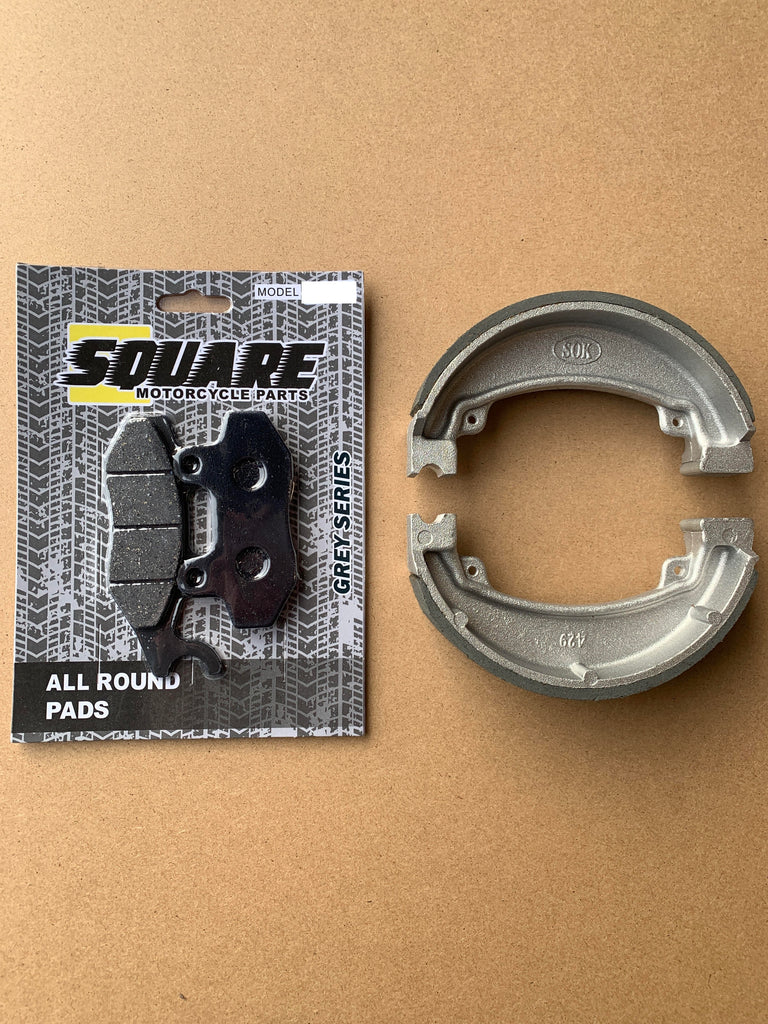 This set of front brake pads and rear brake drum shoes have been manufactured to replace the original brake sets on a Honda VT125 for the years and models shown above.