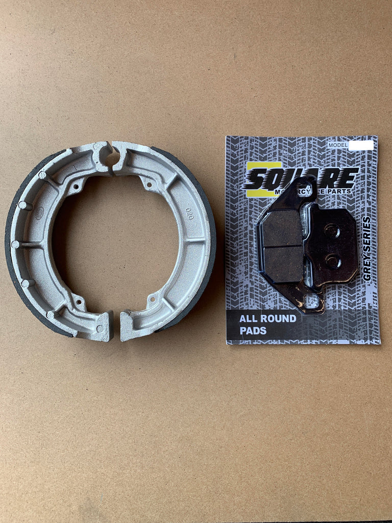This set of front brake pads and rear brake drum shoes have been manufactured to replace the original brake sets on a Kawasaki ER250 for the years and models shown above.