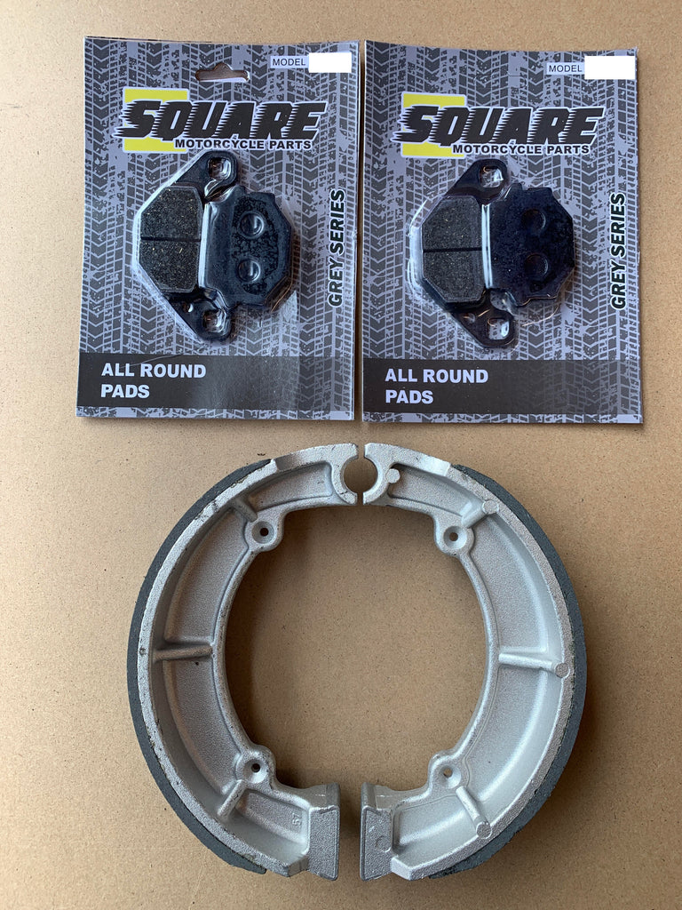 This set of front brake pads and rear brake drum shoes have been manufactured to replace the original brake sets on a Kawasaki GT550 for the years and models shown above.