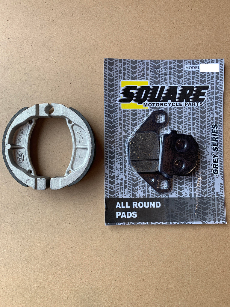 This set of front brake pads and rear brake drum shoes have been manufactured to replace the original brake sets on a Kawasaki KX80 for the years and models shown above.