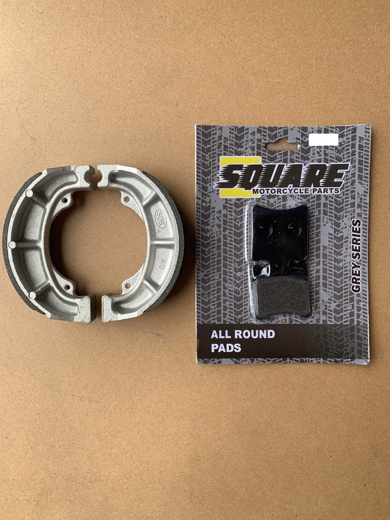 This set of front brake pads and rear brake drum shoes have been manufactured to replace the original brake sets on a Suzuki AP50 for the years and models shown above.