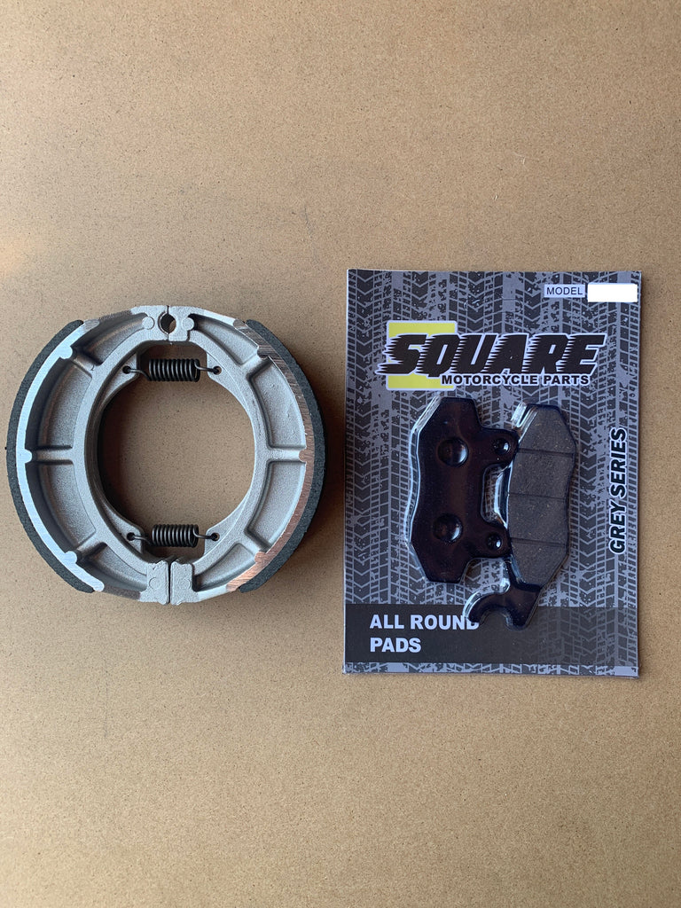 This set of front brake pads and rear brake drum shoes have been manufactured to replace the original brake sets on a Suzuki EN125 for the years and models shown above.