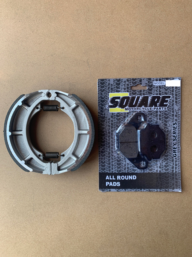 This set of front brake pads and rear brake drum shoes have been manufactured to replace the original brake sets on a Suzuki GN125 for the years and models shown above.