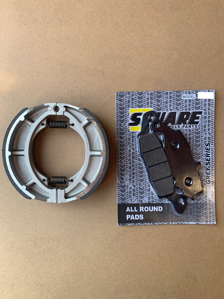 This set of front brake pads and rear brake drum shoes have been manufactured to replace the original brake sets on a Suzuki TU250 for the years and models shown above.