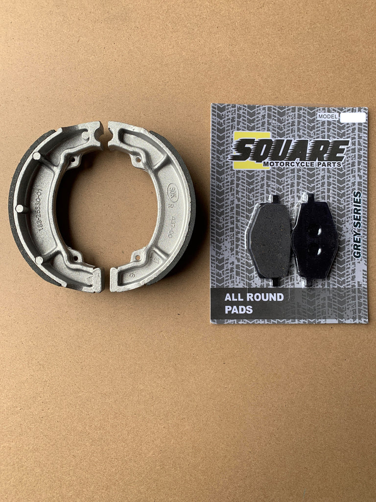 This set of front brake pads and rear brake drum shoes have been manufactured to replace the original brake sets on a Yamaha DT80 for the years and models shown above.