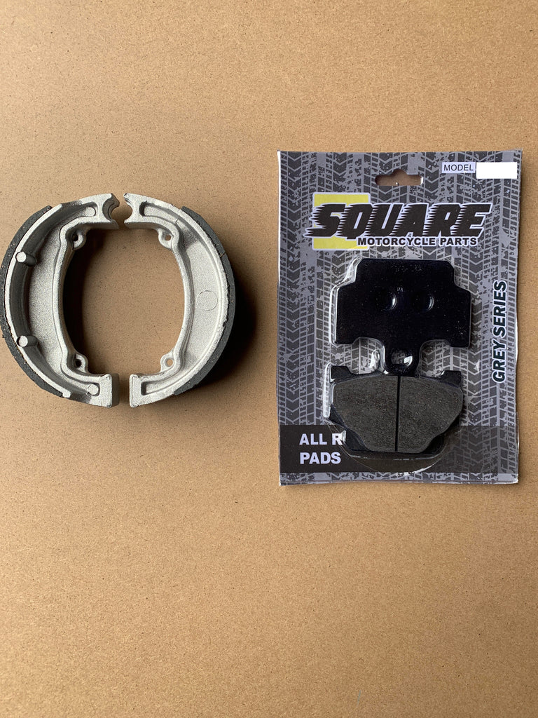 This set of front brake pads and rear brake drum shoes have been manufactured to replace the original brake sets on a Yamaha RD80 for the years and models shown above.