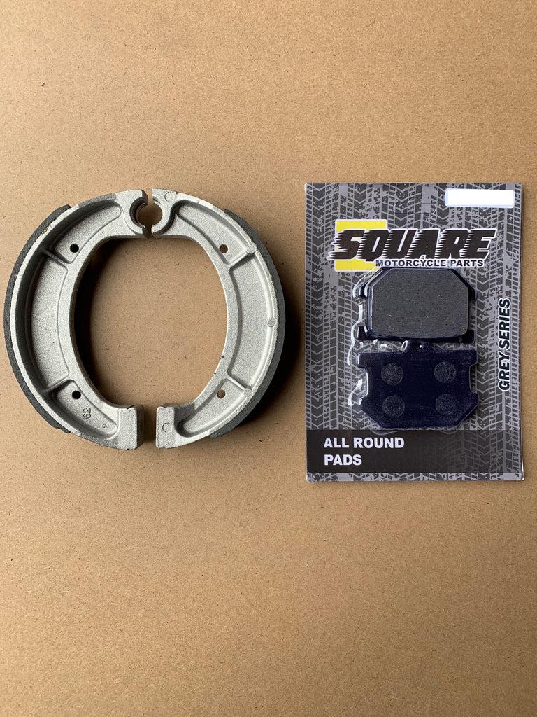 This set of front brake pads and rear brake drum shoes have been manufactured to replace the original brake sets on a Yamaha SR400 for the years and models shown above.
